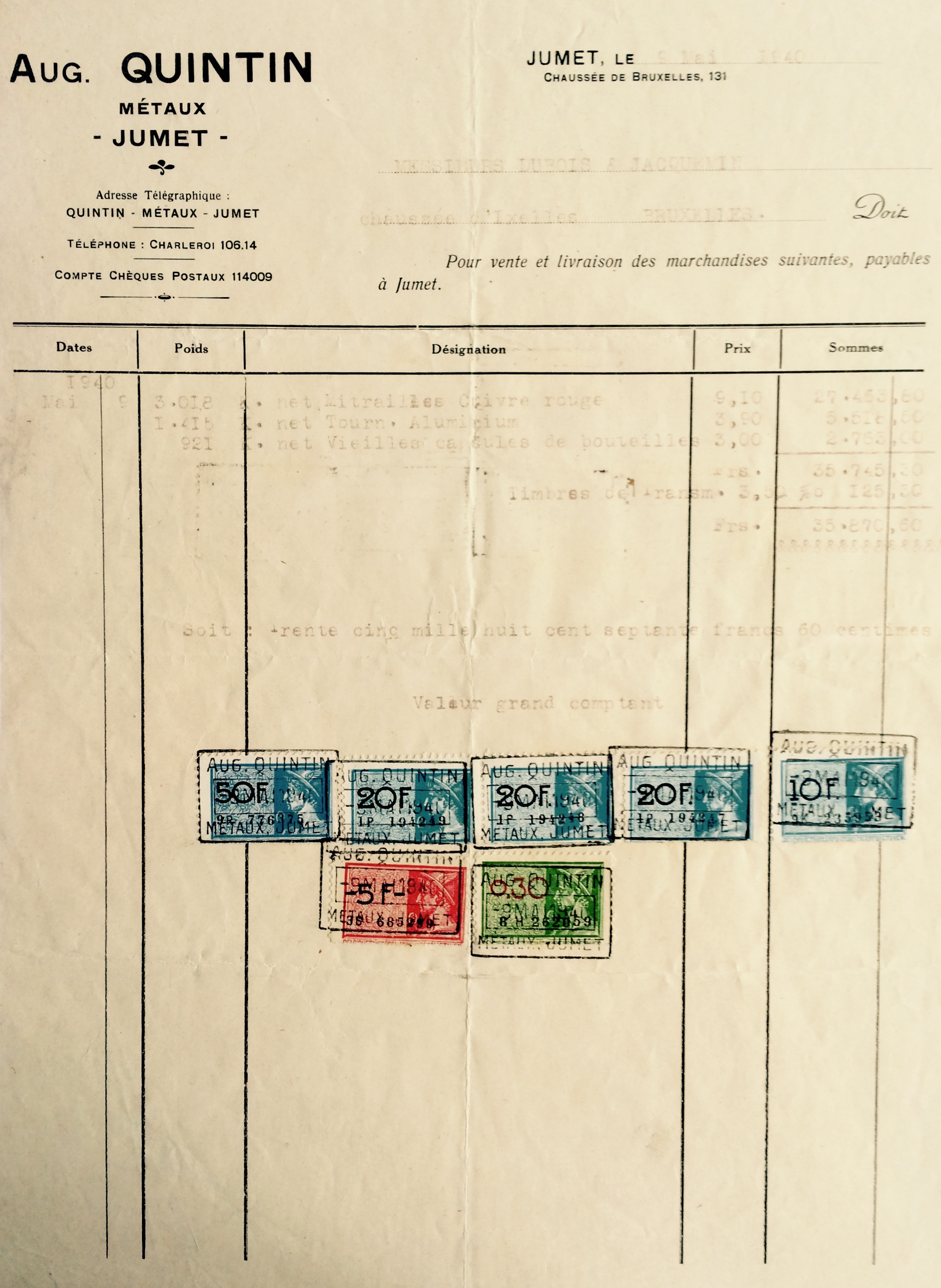 1935 Armand Quintin vient épauler son père dans la société familiale. En 1940, le cuivre est vendu au prix de 9.10 francs belges le kilo.
